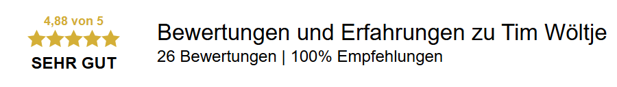 Die Zusammenarbeit mit Tim Wöltje wird nachweislich zu 100 % weiterempfohlen. Überzeuge dich selbst.